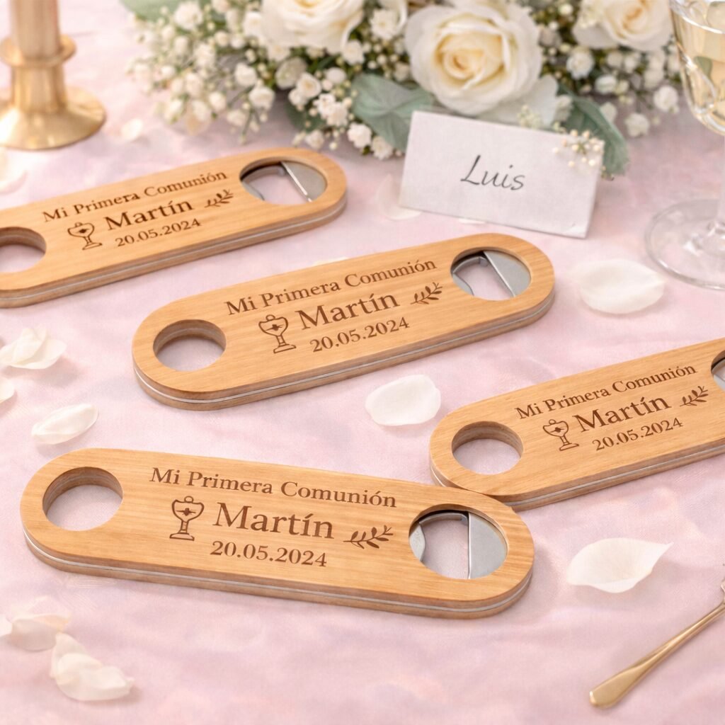 Este abridor de botellas de madera personalizado es un detalle original y práctico para celebraciones especiales. Grabado con láser sobre madera natural, combina diseño elegante y utilidad en una sola pieza.