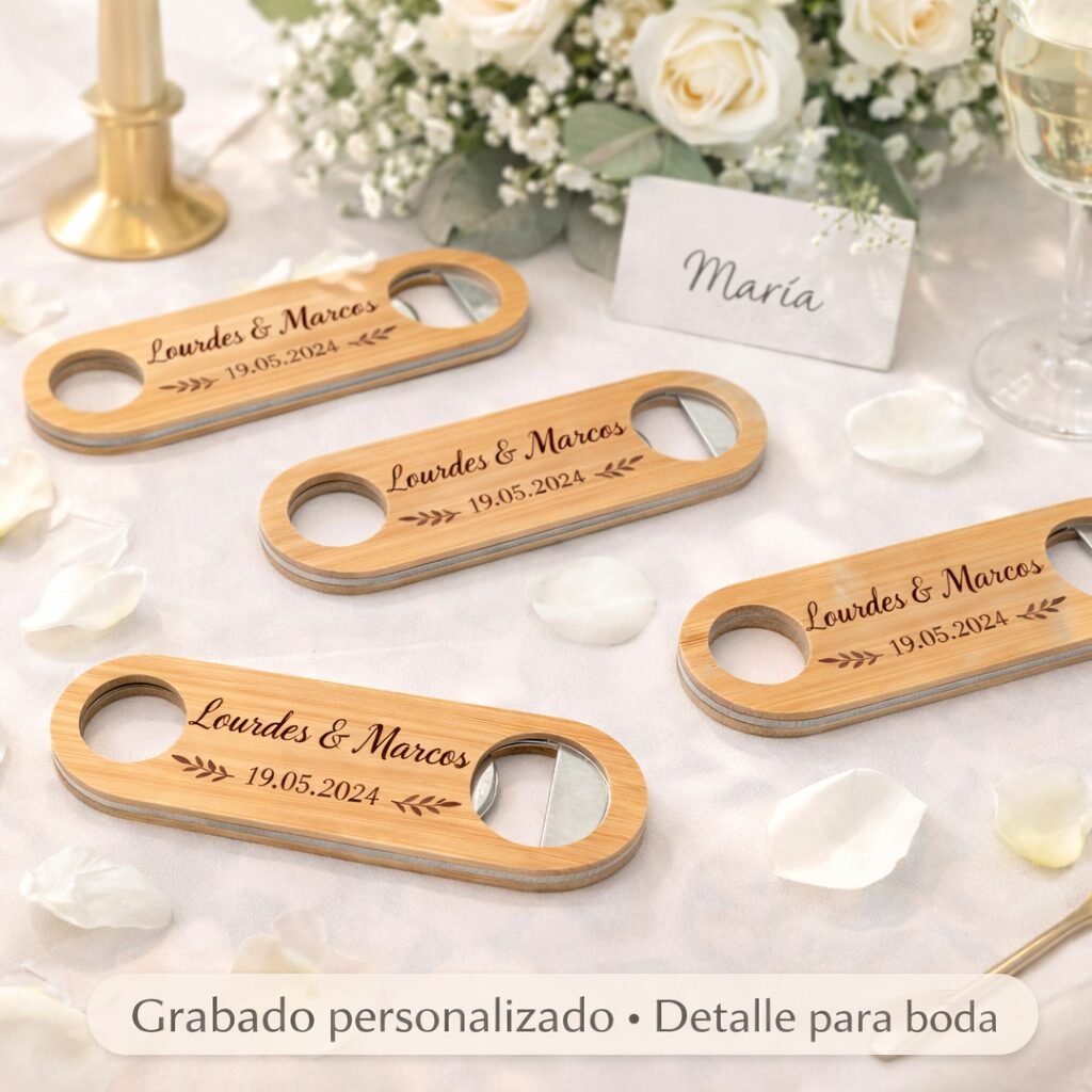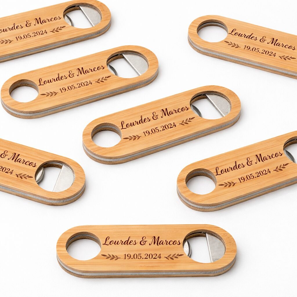 Este abridor de botellas de madera personalizado en formato más estrecho es un detalle elegante y práctico para tus celebraciones. Grabado con láser sobre madera natural, ofrece un diseño fino, cómodo y duradero.