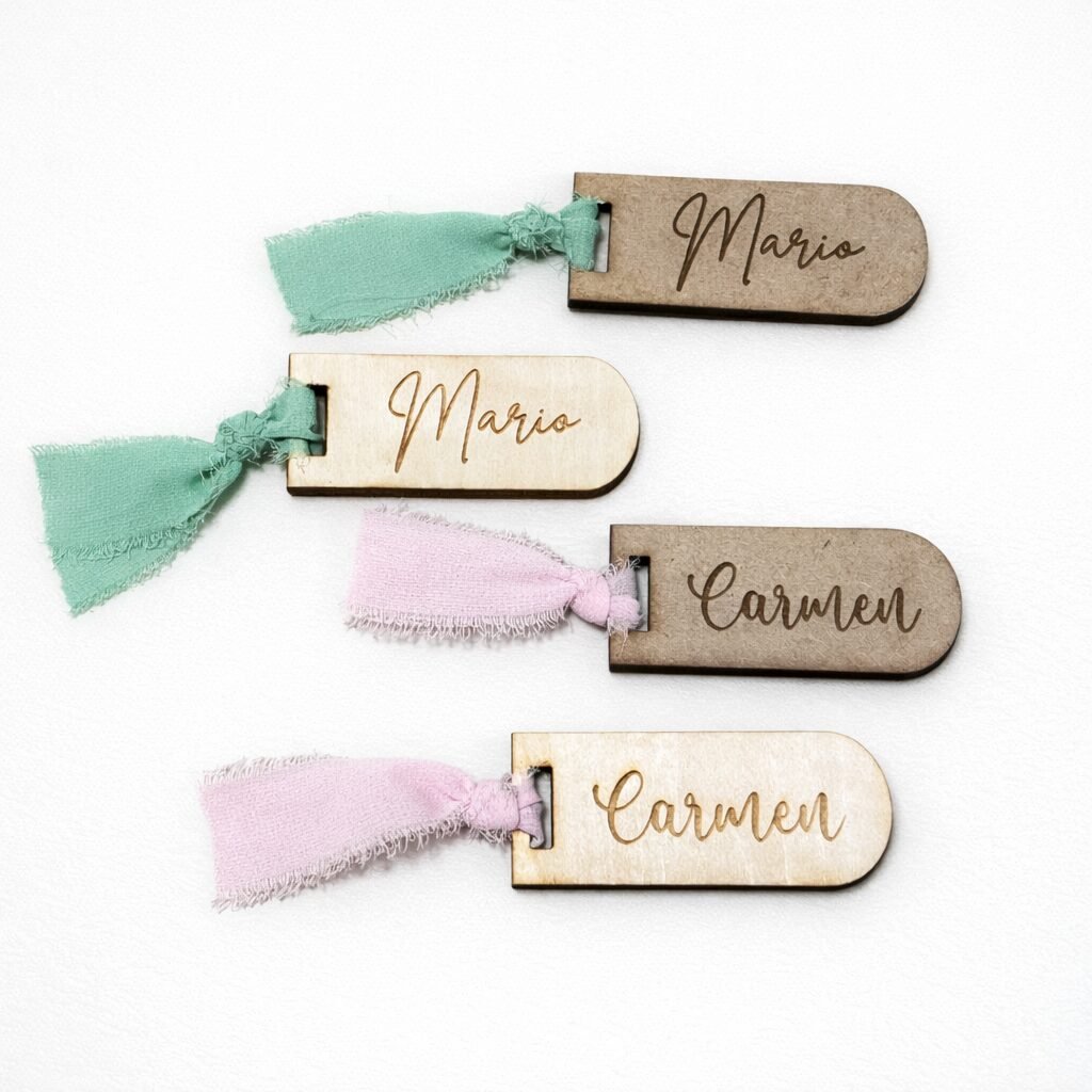 Estos marcasitios de madera personalizados con cinta son un detalle elegante y delicado para organizar las mesas de tu evento. Cada pieza está grabada de forma individual y acompañada de una cinta de tela suave, aportando un acabado natural y romántico que realza la decoración.