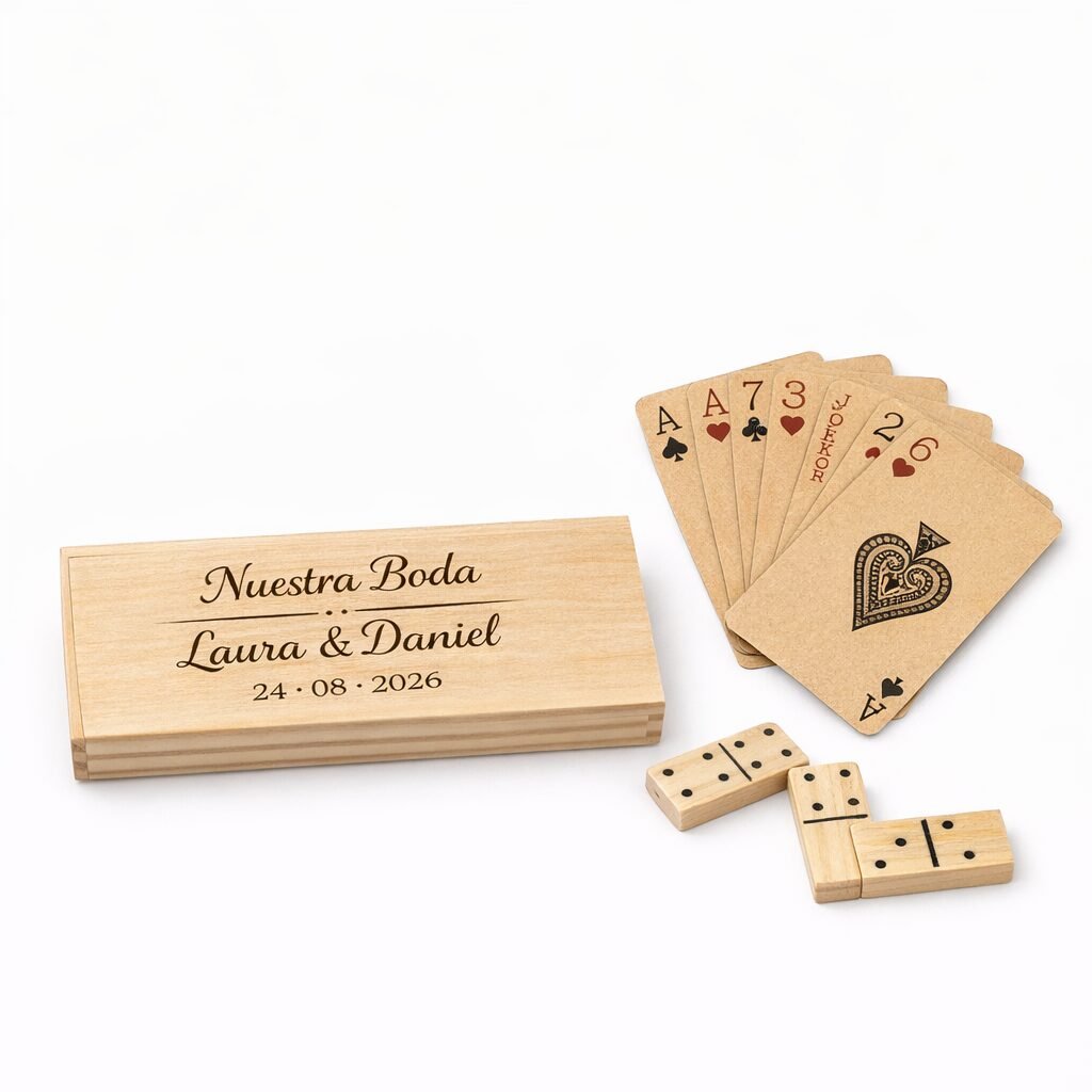 Un detalle perfecto para bodas, comuniones, eventos y regalos personalizados, que combina diversión, sostenibilidad y estilo en un solo producto. La baraja está fabricada en cartón reciclado y el dominó en madera resistente, convirtiéndolo en una opción más ecológica y reutilizable.
